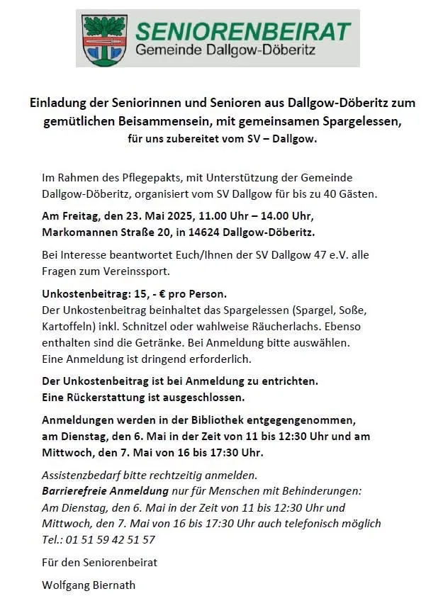 Am 23.05.2025 findet in gemütlicher Runde im Bogensporthaus, Markomannenstr. 20, ein gemeinsam mit dem Seniorenbeirat organisiertes Spargelessen statt. Anmeldungen nimmt die Bibliothek am 6.Mai 11:00-12:30 und 7.Mai 16:00-17:30 Uhr entgegen.