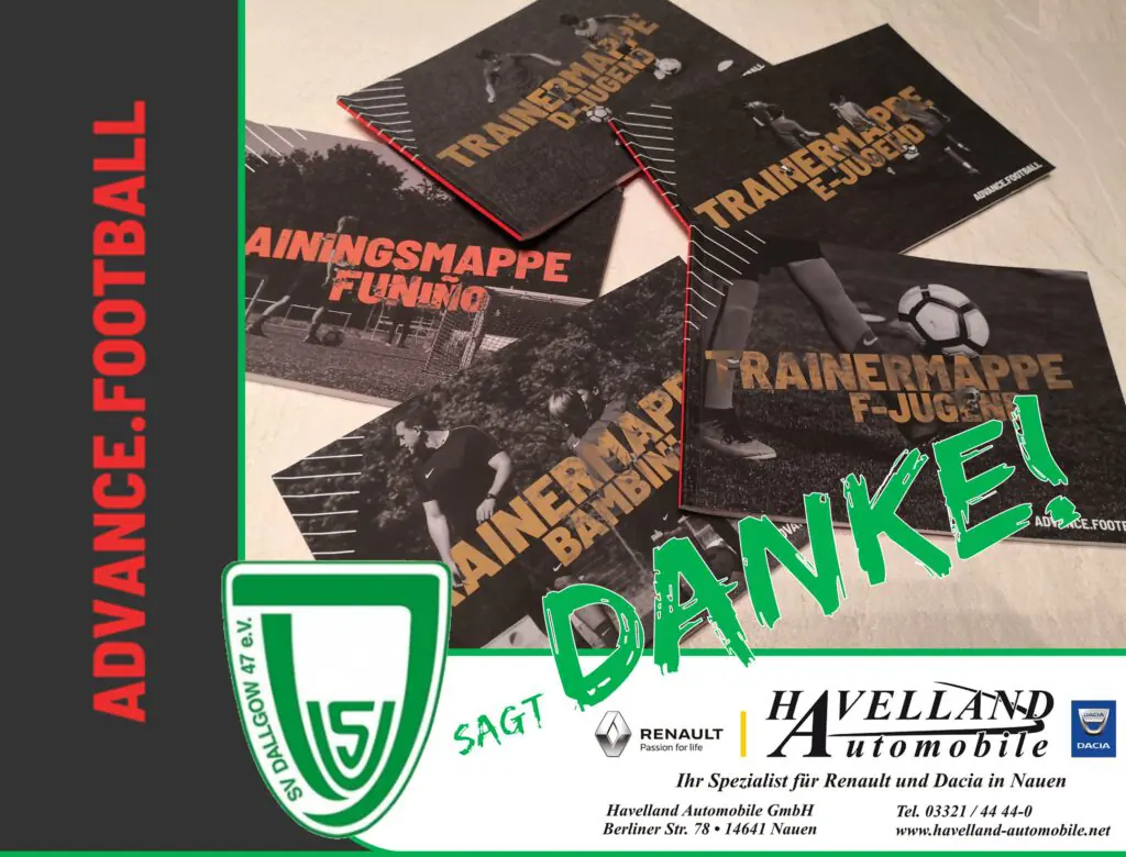 Unsere Fußballtrainer:innen wurden von Havelland Automobile (Renault Autohaus) überrascht und haben die Trainermappen von Advance.Football geschenkt bekommen. Nun kann die Abteilung Fußball gemeinsam mit dem Trainerteam an der Kinderfußballphilosophie feilen und alle Trainer:innen bekommen so einen wunderbaren Überblick über Don’ts und Dos, Trainingsinhalte und Best Practice Tipps zum Thema Kinder- und Jugendfußball.