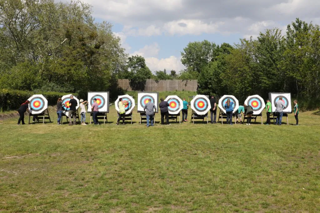 Anschließend üben wir auf 10 Meter Entfernung, bis alle Teilnehmer die Scheibe treffen. Anschließend wird die Entfernung auf 20 Meter erhöht. Hier führen wir ein Turnier mit Wertungspfeilen durch und küren den besten Bogenschützen.