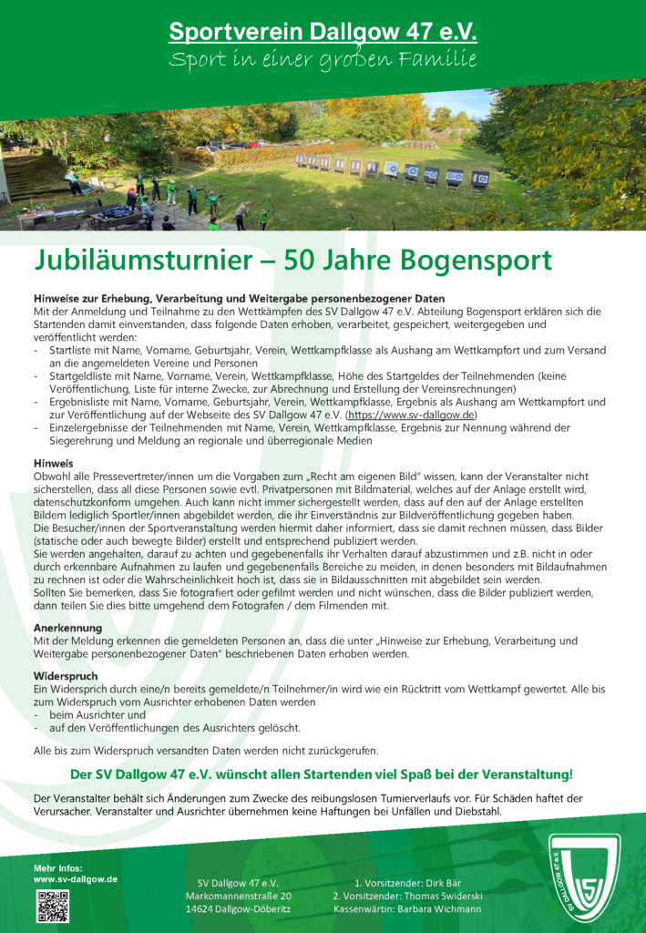 Angemeldet sind für Samstag 208 und Sonntag 67 Teilnehmer. Vom SV Dallgow sind 9 Schützen gemeldet. Geschossen wird in den Disziplinen Olympisch Recurve und Compound auf bis zu 70m.
